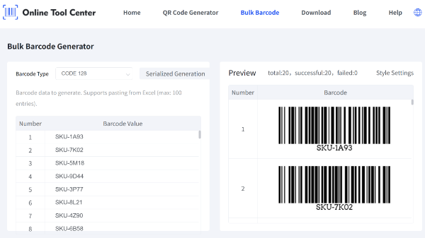 إنشاء الشحن والتغليف الباركود بالجملة مع أداتنا المجانية على الإنترنت. نسخ ولصق قائمة إكسل الخاصة بك، واختر نوع الباركود، وتحميل جميع التسميات على الفور.